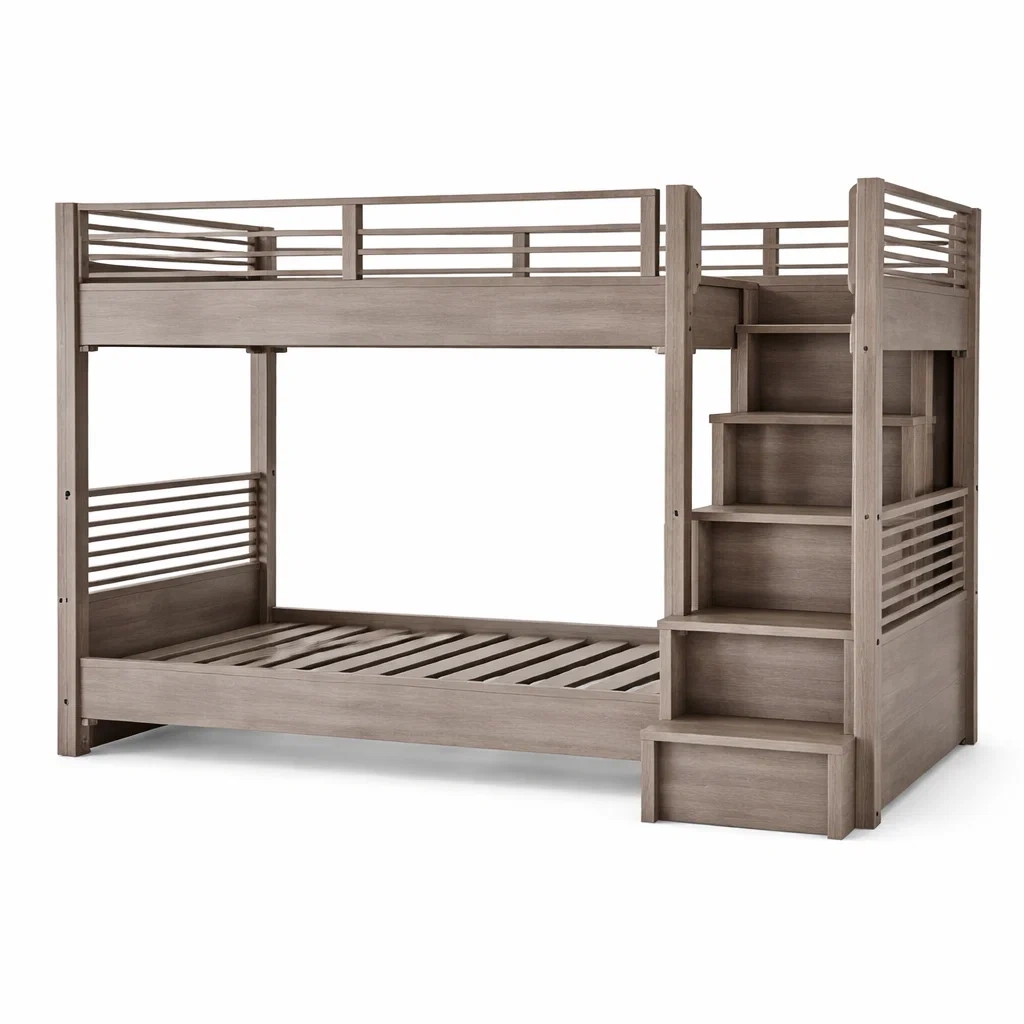 Le lit présente un design avec des escaliers intégrés. Il est composé de deux lits avec une échelle latérale. Ce produit nécessite un assemblage, et les instructions sont incluses.