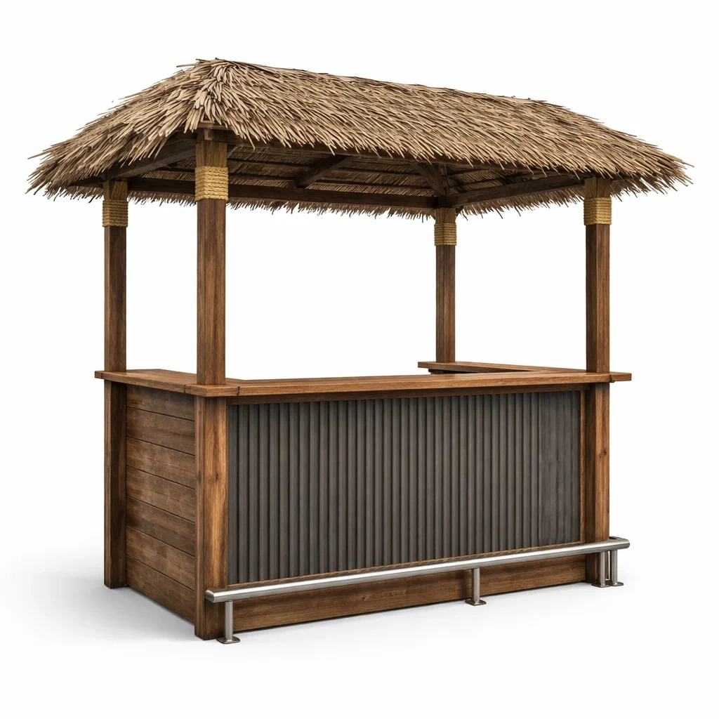 Ce bar extérieur est conçu en bois robuste avec des éléments en métal, offrant une structure stable et durable. Le toit est réalisé en chaume naturel, apportant une touche d'authenticité. Les dimensions du bar sont de 200 cm de longueur, 100 cm de largeur et 250 cm de hauteur. La barre repose sur une base en acier inoxydable, offrant une résistance supplémentaire. Ce produit nécessitera un assemblage.